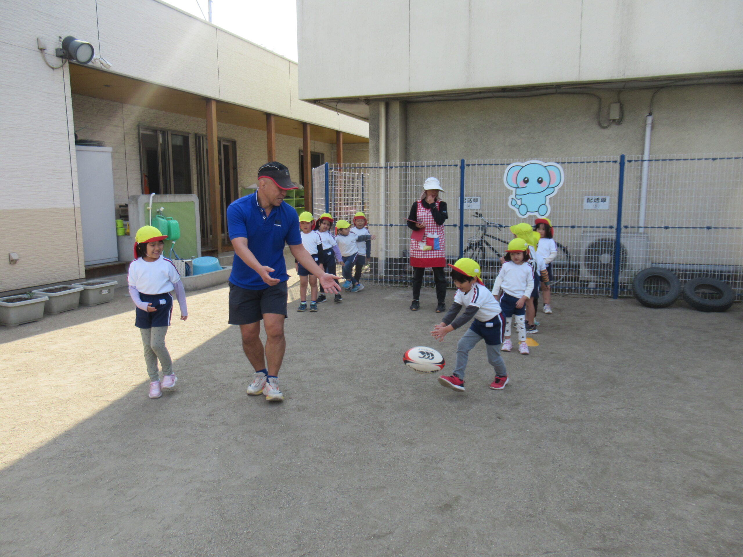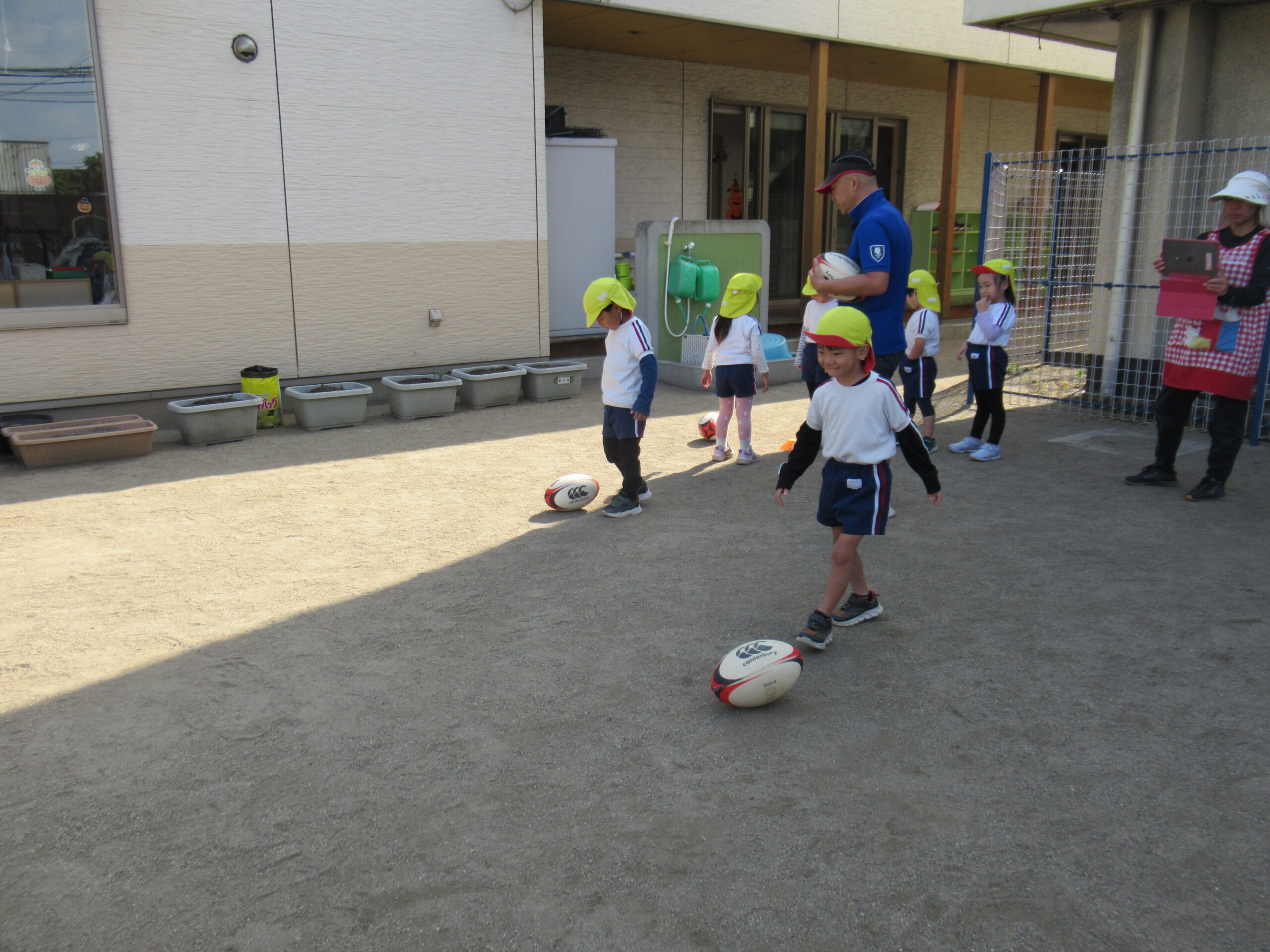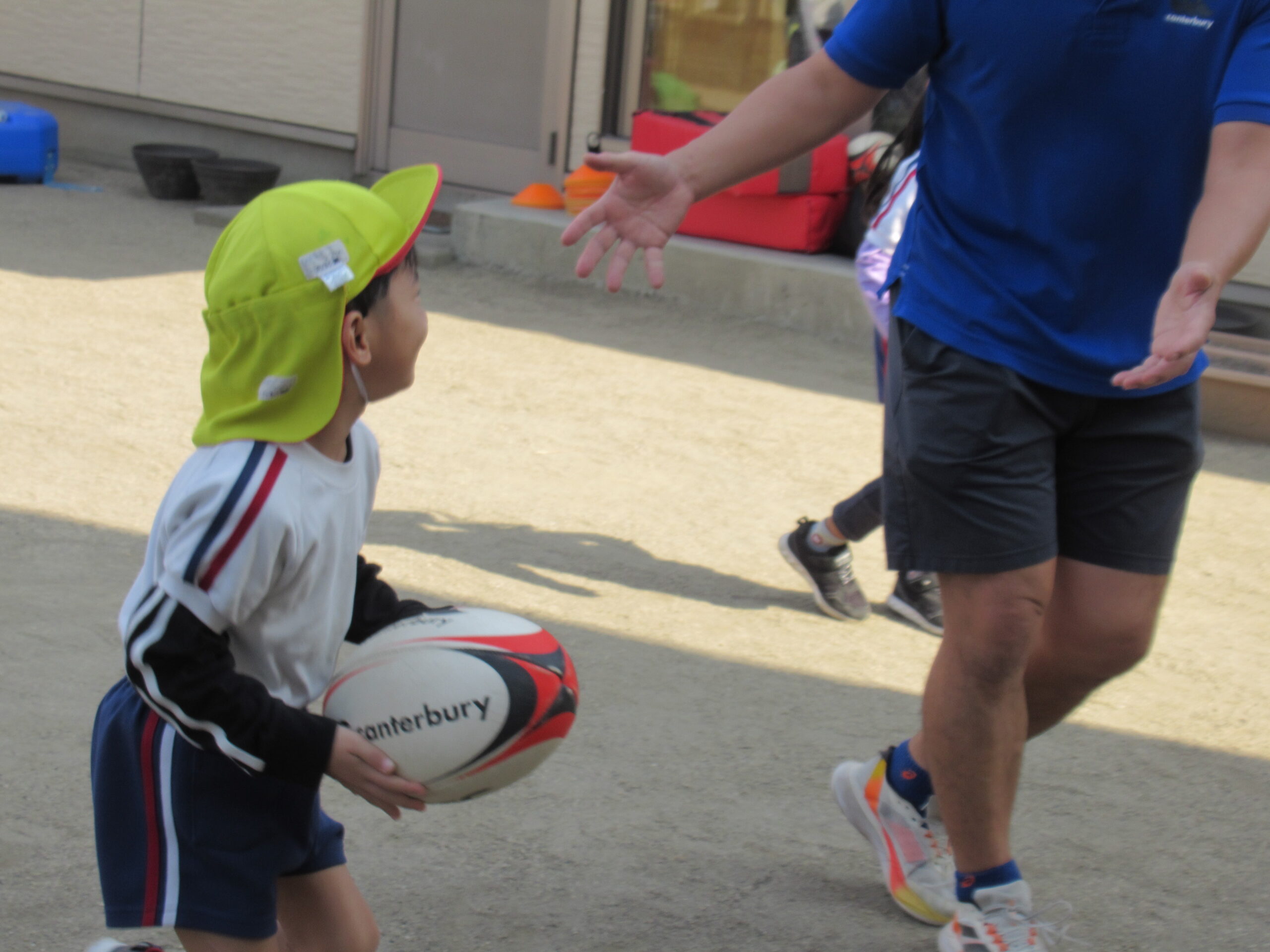 ラグビー体験に参加しました。普段使うボールとは違う形に興味津々。パスをしたり蹴ってみたり、楽しい時間でした。